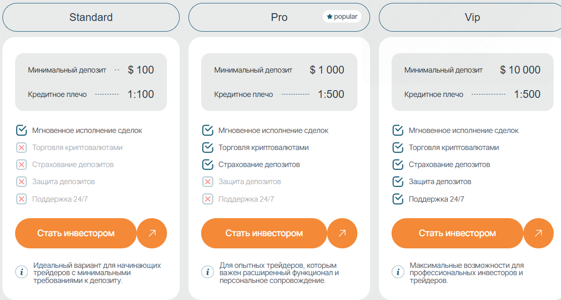Demisto xyz предлагает 3 типа счетов. Тарифы отличаются минимальным взносом и плечом: