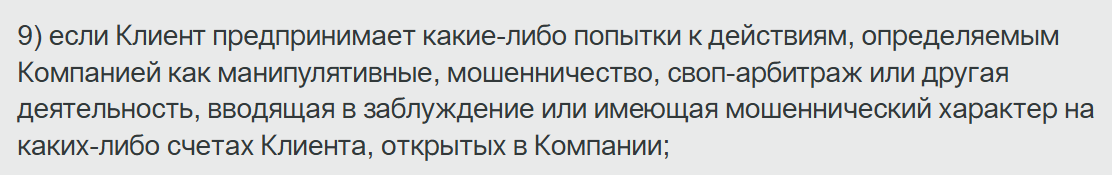 В документах прописаны условия, которые дают компании полную свободу действий. Организация может закрыть любую сделку без объяснений. Вычесть прибыль, если сочтет ее неправомерной.