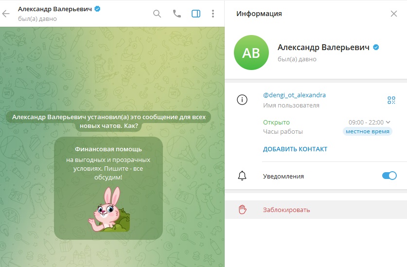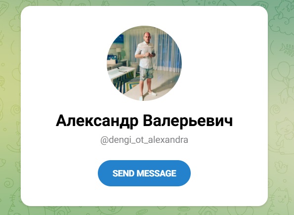 Владелец паблика в Телеграм представился как Александр Валерьевич, личный аккаунт @dengi ot alexandra. Со своими клиентами он общается только в личке. Объявления о том, что Alexandr помогает решить сложные финансовые ситуации появляются на форумах в соцсетях. Там в доверительном общении “по секрету” дают контакт человека, который помог деньгами. Он якобы очень богатый, свой капитал заработал и продолжает увеличивать на спортивных ставках в БК 188 бет.