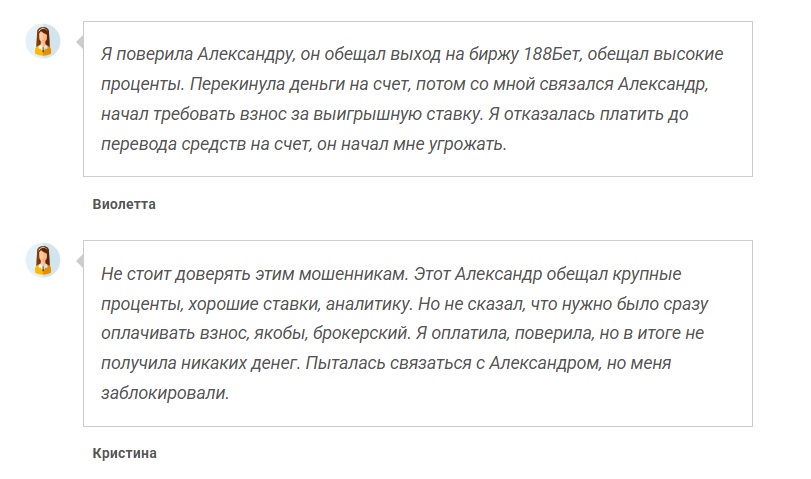 При обращении к админу, ответ поступает быстро, он уточняет на какую сумму вы рассчитываете. Дальнейшие предложения зависят от результатов общения и названой цифры. Если она небольшая, то Александр предлагает увеличить ее за счет беттинга. Никаких навыков не требуется, достаточно просто перечислить деньги на указанный счет, всю остальную работу он сделает сам, а клиент получит сумму, увеличенную в десятки раз.