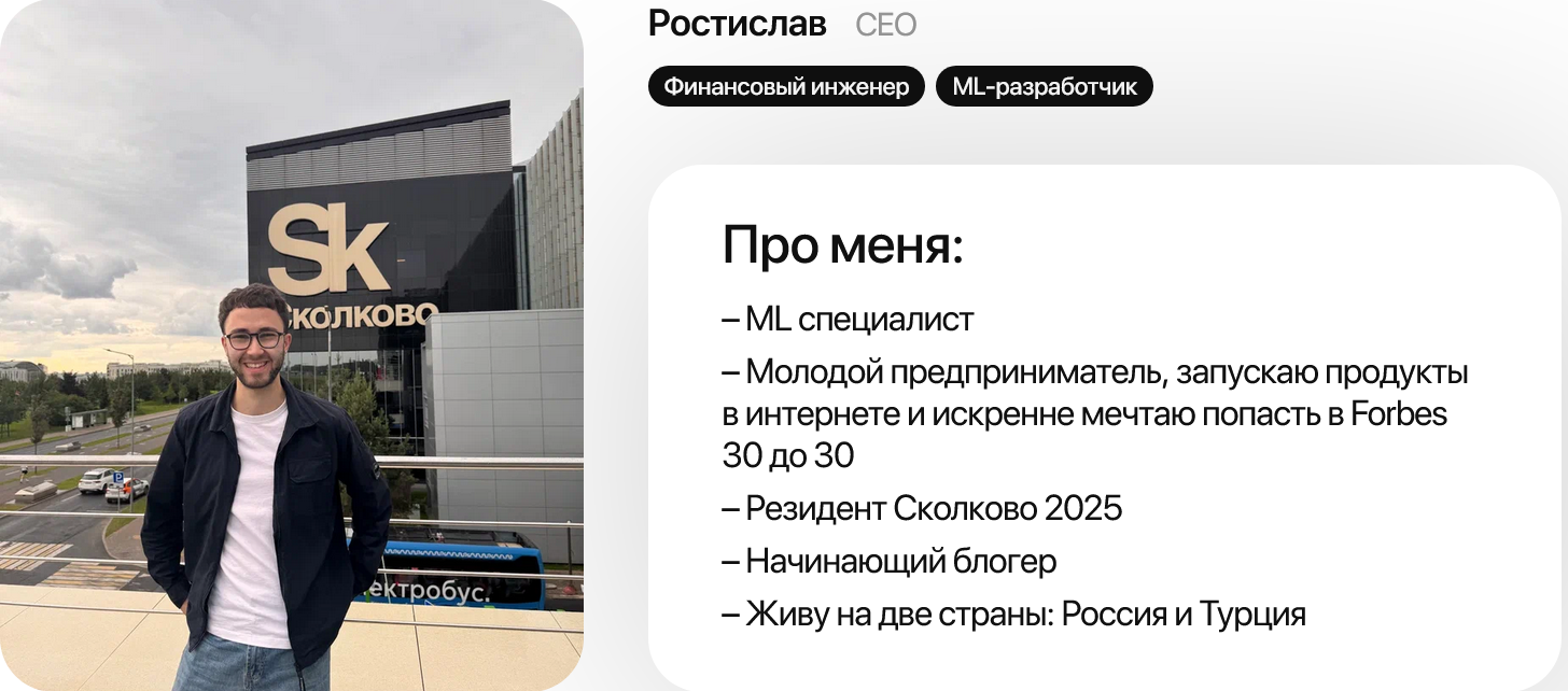 Основатель проекта — молодой человек по имени Ростислав с ником в Телеграмм @rostislavdept. На сайте, посвященном трейдингу, мужчина немного о себе рассказал: резидент Сколково 2025, начинающий успешный блогер, молодой, но уже опытный предприниматель.