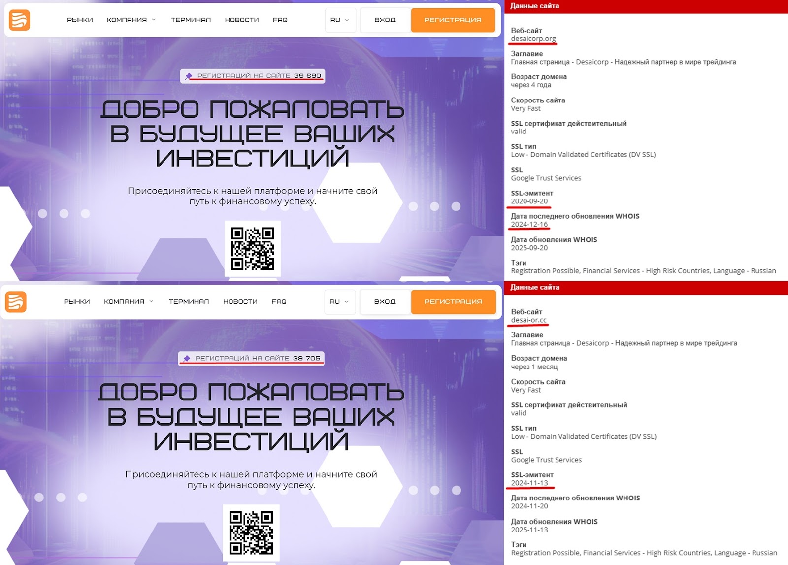 У desaicorp org есть копия сайта с доменом desai or cc. Веб-ресурс desai or cc создан 13 ноября 2024 года. При проверке было выявлено 1 отличие в интерфейсе — общее количество регистраций на главной странице. Создание сайта-клона может быть связано с жалобами и скорой блокировкой домена desaicorp org.