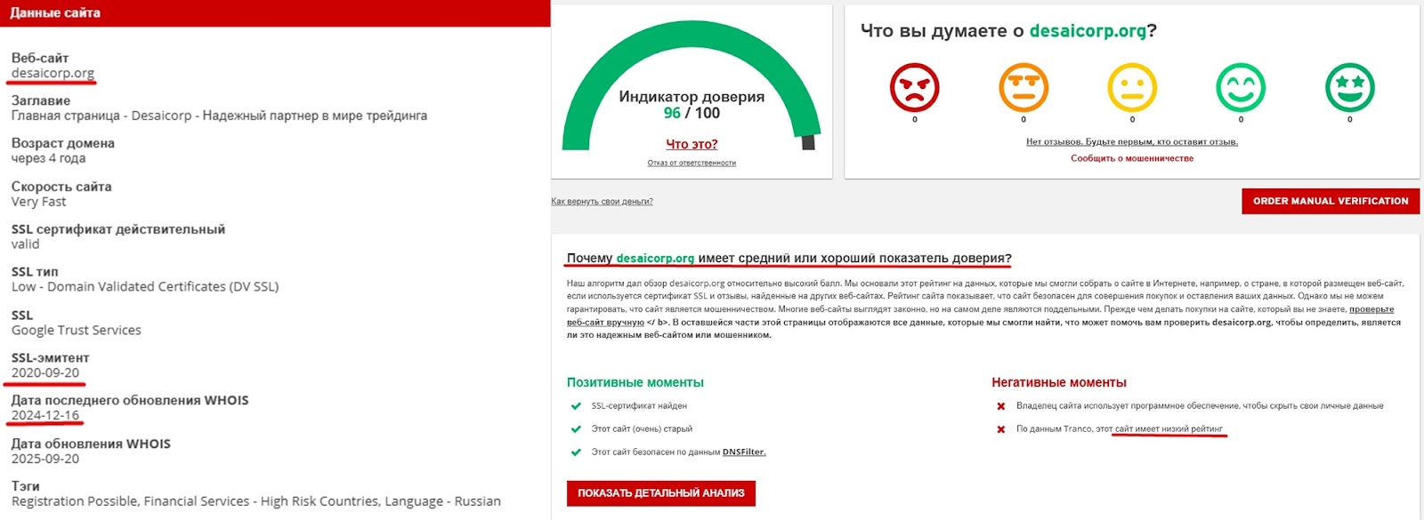 Домен desaicorp org создан 20 сентября 2020 года и изменен 16 декабря 2024 года. Обе даты не соотносятся с началом деятельности проекта в 2017 году. Рейтинг доверия у веб-ресурса средний, но отсутствует поток трафика. Что говорит о непопулярности сервиса у трейдеров.
