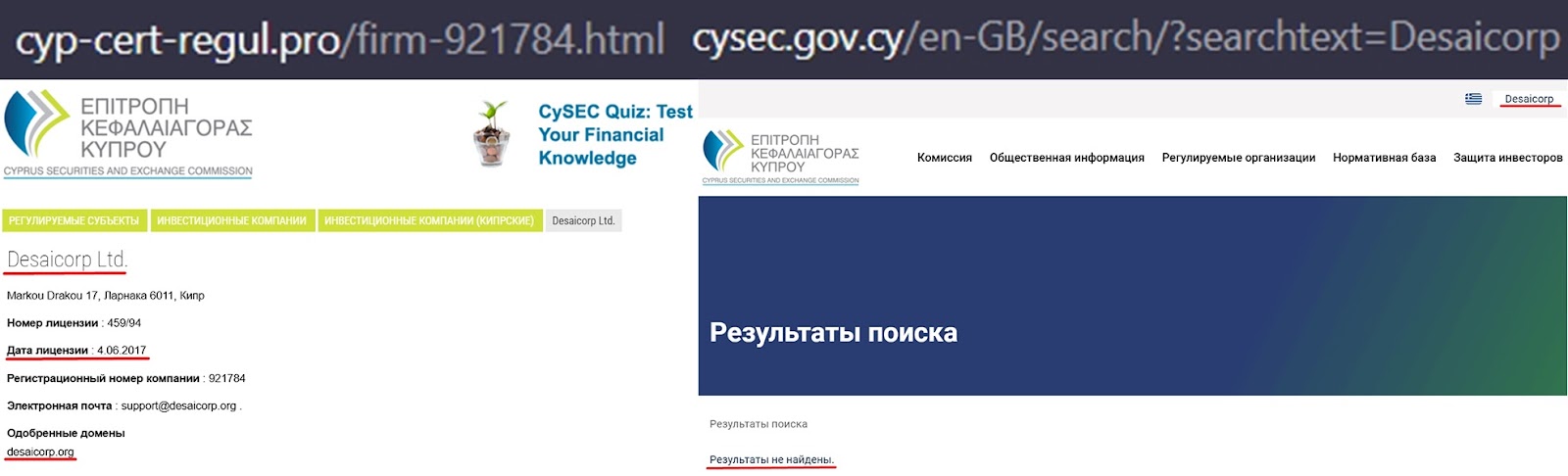 Лицензия на торговую деятельность desaicorp располагаются на поддельных веб-страницах. Например, слева указана информация о регуляторе с сайта desaicorp org, а справа результат поиска на официальном сайте CySEC. Важно заметить, что домены веб-ресурсов отличаются. Это говорит о фейковых данных про брокера.
