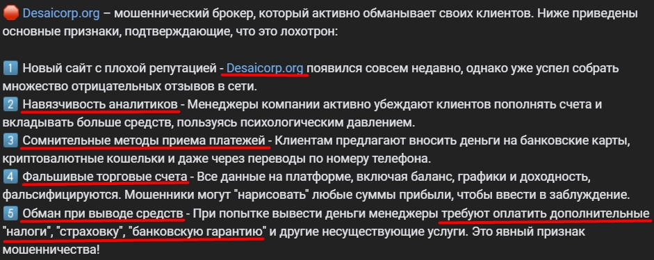 О компании desaicorp org трейдеры могут найти 24 негативных обзора. Это связано с разводом пользователей и постоянным увеличением количества жалоб в адрес брокерского сервиса.