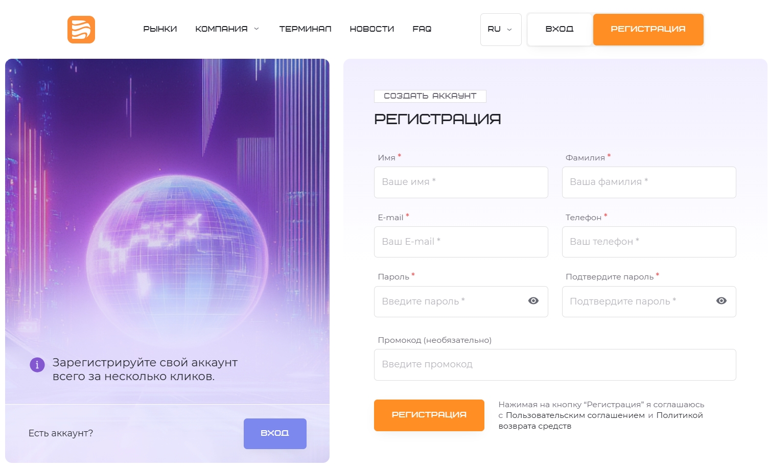 Для трейдинга на платформе desai corp пользователь должен зарегистрироваться. Подтверждать электронную почту и телефон не требуется, что говорит о недостаточном уровне безопасности.