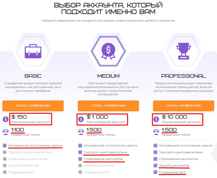 Брокер предлагает трейдерам 3 типа аккаунта для торговли: базовый, средний и профессиональный. Например, базовый счет клиент может открыть при депозите от 150$. Пользователю будет доступно кредитное плечо 1:100 и мгновенные сделки, но закрыты трейдинг криптовалютой, техподдержка и страхование активов.
