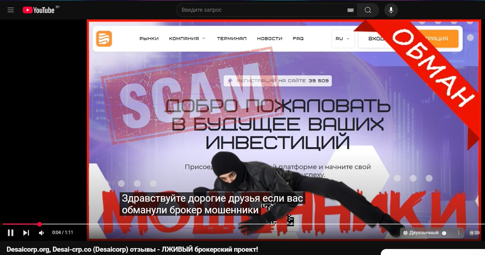 В видео обзорах на youtube пользователи могут ознакомиться с разоблачением брокера desaicorp. Ютубер сообщает, что проект использует агрессивный маркетинг и уговаривает клиентов инвестировать через сервис desai corp. Злоумышленники требуют регулярное внесение депозита.