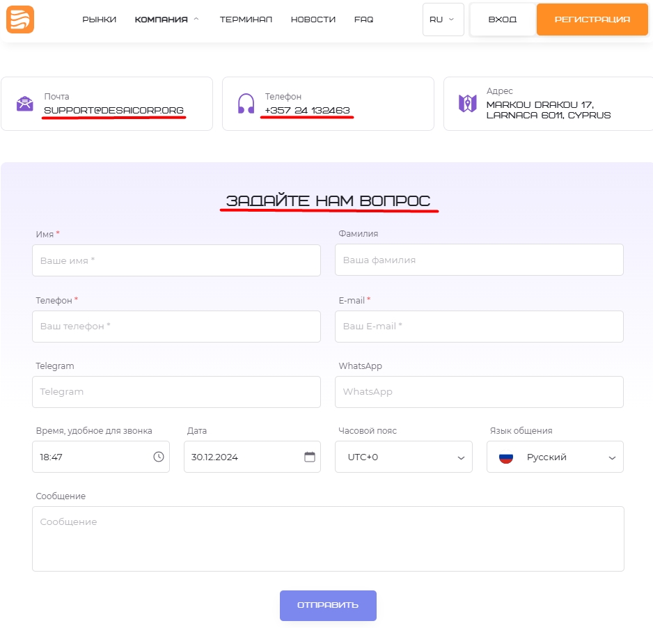 На отдельной веб-странице пользователи могут связаться со службой поддержки. Дополнительно указан контактный телефон с кодом Кипра.Отзывы клиентов о сотрудничестве с desaicorp