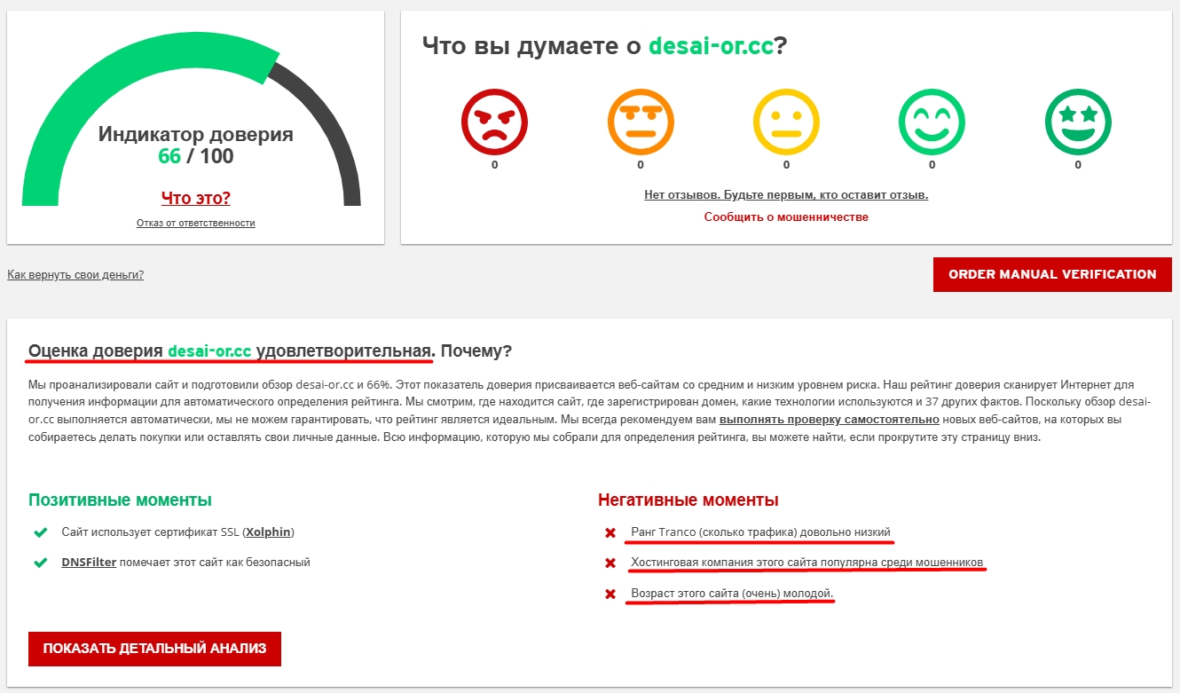 Сайт-клон имеет удовлетворительный рейтинг. Но хостинговая компания сайта desai or cc используется мошенниками. На платформе отсутствует трафик, что говорит о фейковых данных о торговых оборотах.