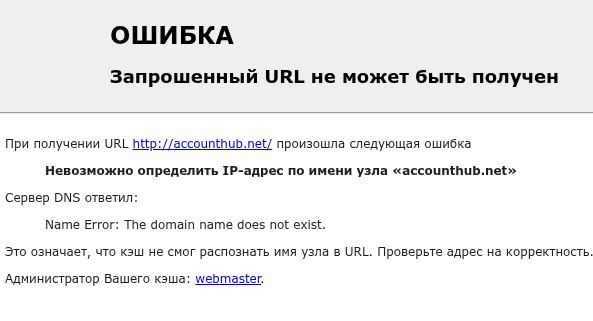 Если перейти по официальной ссылке на брокера с личного кабинета wt descview me, то пользователь получает предупреждение об удалении сайта. Ошибка выглядит следующим образом — «ОШИБКА Запрошенный URL не может быть получен. При получении URL http:// accounthub net/ произошла следующая ошибка. Невозможно определить IP-адрес по имени узла accounthub net. Сервер DNS ответил. Name Error: The domain name does not exist. Это означает, что кэш не смог распознать имя узла в URL. Проверьте адрес на корректность».
