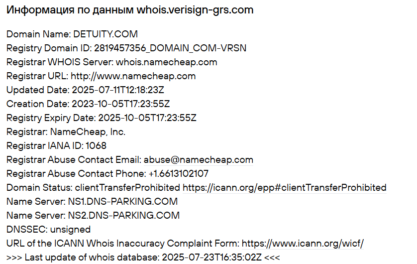 Сайт обменника Detuity com был зарегистрирован в 2023 году, но последние обновления на нём были в 2025 году, откуда можно предположить, что биржа обслуживает клиентов только пару недель. При этом компания позиционирует себя надёжным партнёром, проверенным временем.