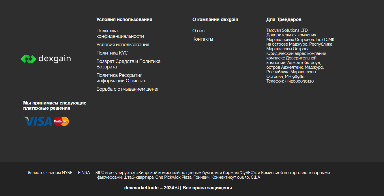 Особо много данных о себе инвестиционный брокер Dexgain не раскрывает. Из его официального сайта dexgain com мы знаем, то что компания зарегистрирована на Маршалловых Островах и была основана только в 2024 году.