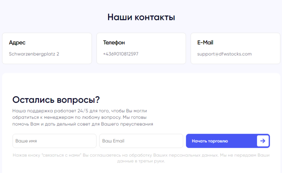 По всем вопросам руководство предлагает обращаться по номеру телефона или электронной почте support dfwstocks com. В течении какого времени менеджер ответит клиенту – неизвестно. Но поддержка работает круглосуточно только 5 дней в неделю.