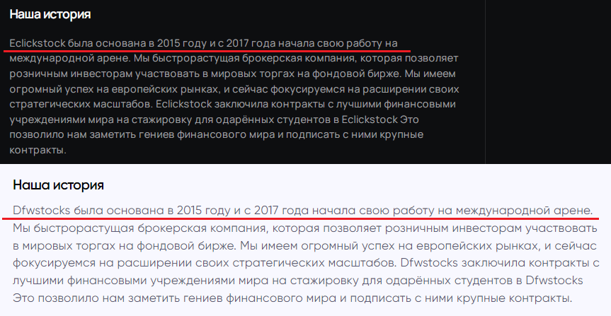 Также мы обнаружили, что на одном скам-ресурсе звучала идентичная история проекта, как и у Eclickstock. Остальное текстовое наполнение сайта также оказалось скопированным. На данный момент все указывает на то, что проект является таким же лохотроном.