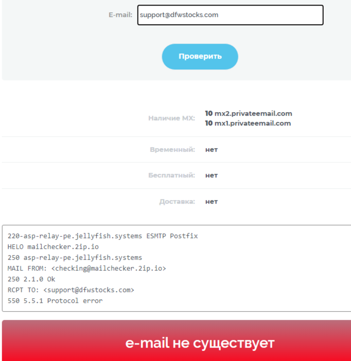 Только оказалось, что данный электронный адрес не существует. Это не удивительно, ведь многое в деятельности фирмы Dfwstocks Com указывает на то, что это ловушка, а ее основатели – мошенники.