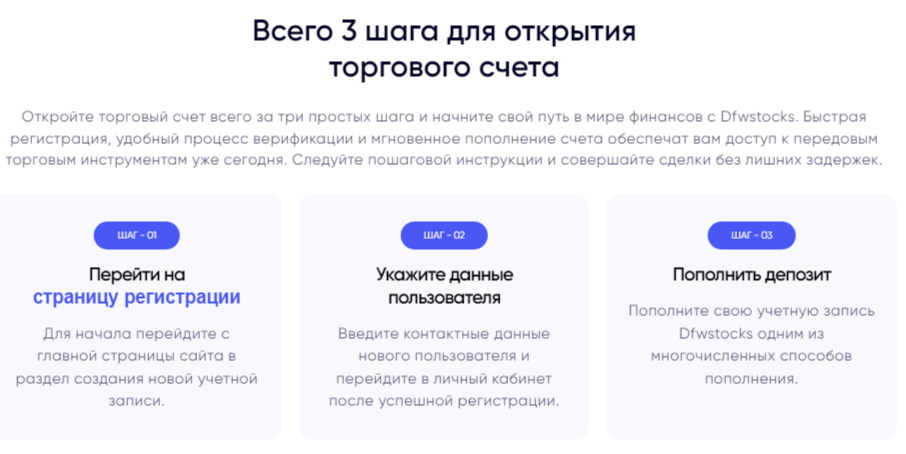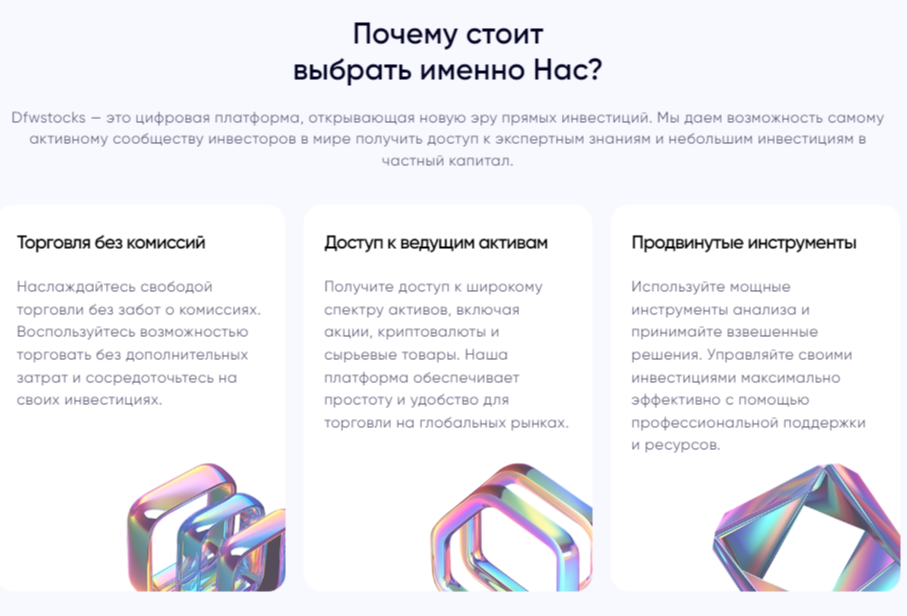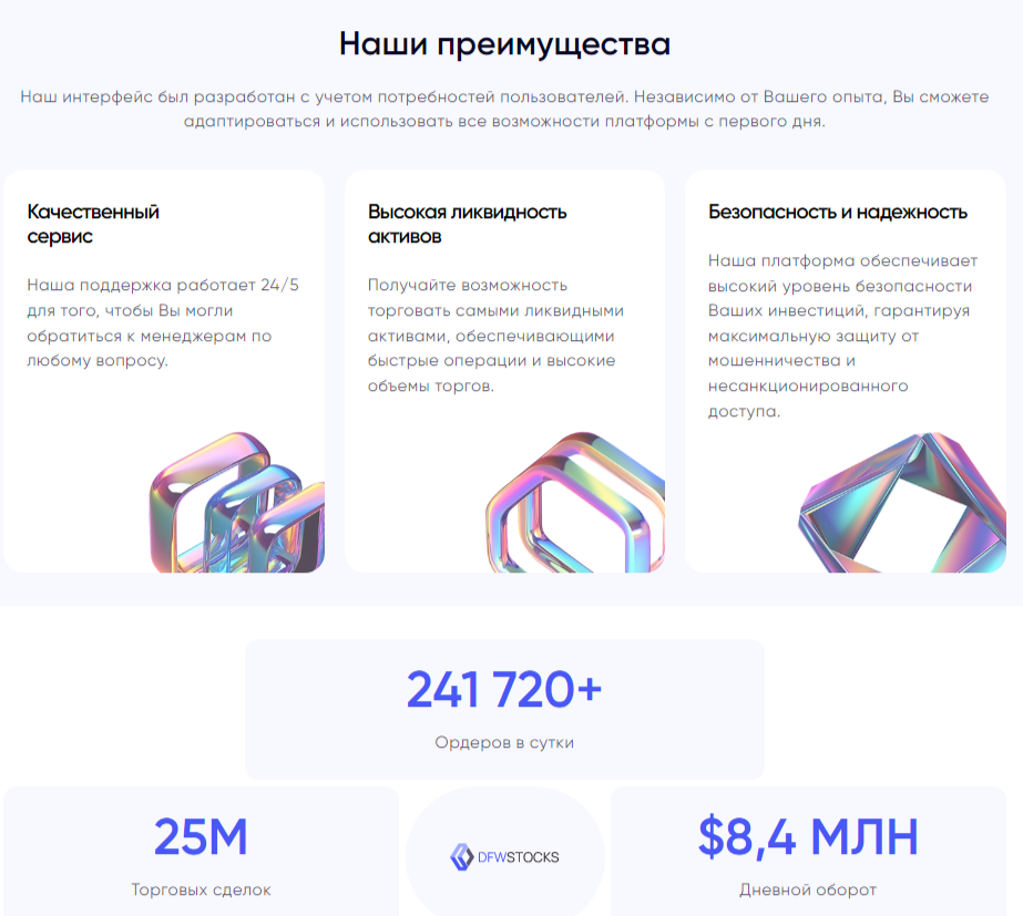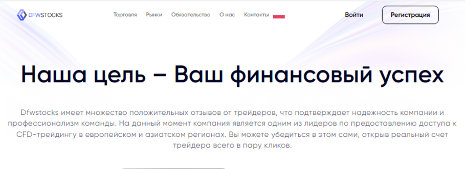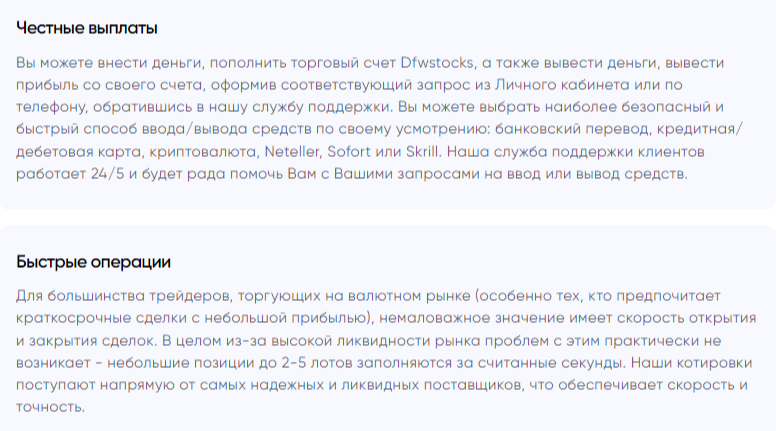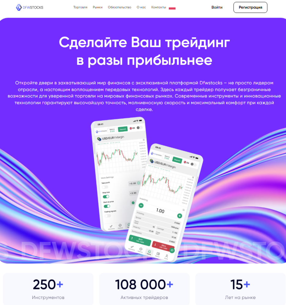 На главной странице проекта Trade Dfwstocks Com трейдерам предлагается сделать их работу прибыльнее. Якобы на их площадке есть все для этого. Также авторы гарантируют безопасность, точность и быстрое исполнение операции. Вероятно, этот набор фраз используется просто для привлечения внимания.