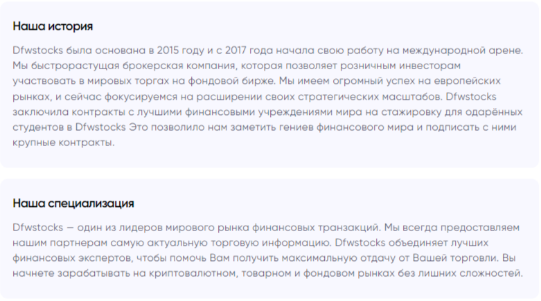 Как оказалось, на официальном сайте брокера Dfwstocks Com расположена достаточно подробная история проекта. Фирма была создан в 2015 году, и уже через два года ей удалось выйти на международный рынок. Данная площадка позволяет участвовать в торгах обычным инвесторам, и благодаря этому они и заработали их доверие.