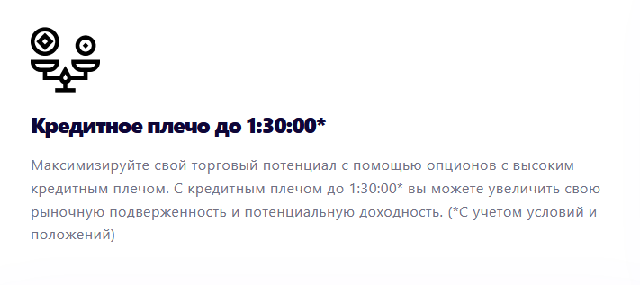 • Предлагается высокое кредитное плечо – 1:30:00;