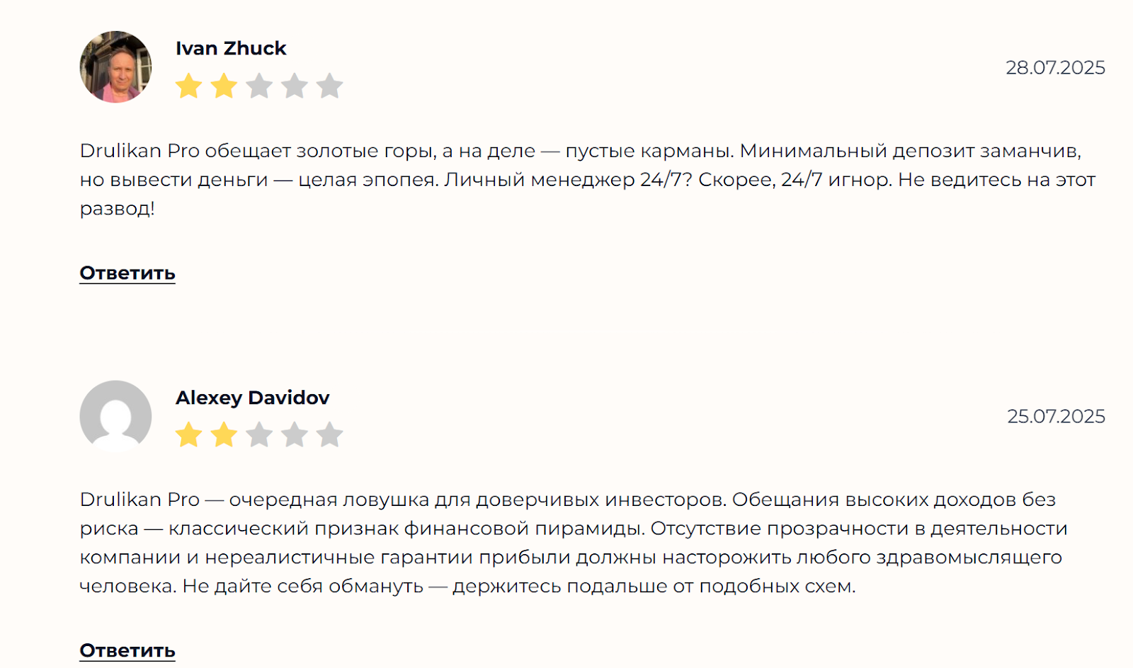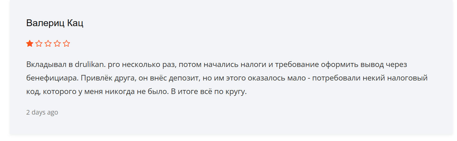 В многочисленных отзывах о Drulikan клиенты отмечают пустые обещания брокера. Служба поддержки игнорирует запросы, а вывести деньги — целая проблема. Пользователи отмечают, что Друликан представляет собой обычную ловушку для инвесторов без опыта.