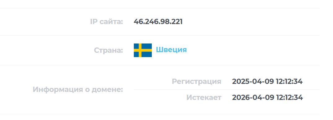 Посредник предлагает услуги через сайт Drulikan PRO. Ресурс переведен на русский язык, что является плюсом для пользователей из СНГ. Шаблон является стандартным и встречается на многих подобных платформах. Что касается домена, он зарегистрирован в Швеции только 9 апреля 2025-го.