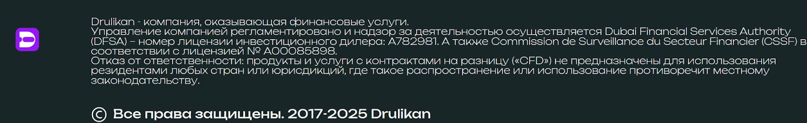 В футере сказано, что брокер Drulikan работает под регулированием DFSA и CFFS. В обоих случаях указывается номер лицензии без ссылок для проверки. При этом скрины документов и иная подтверждающая документация также отсутствуют.
