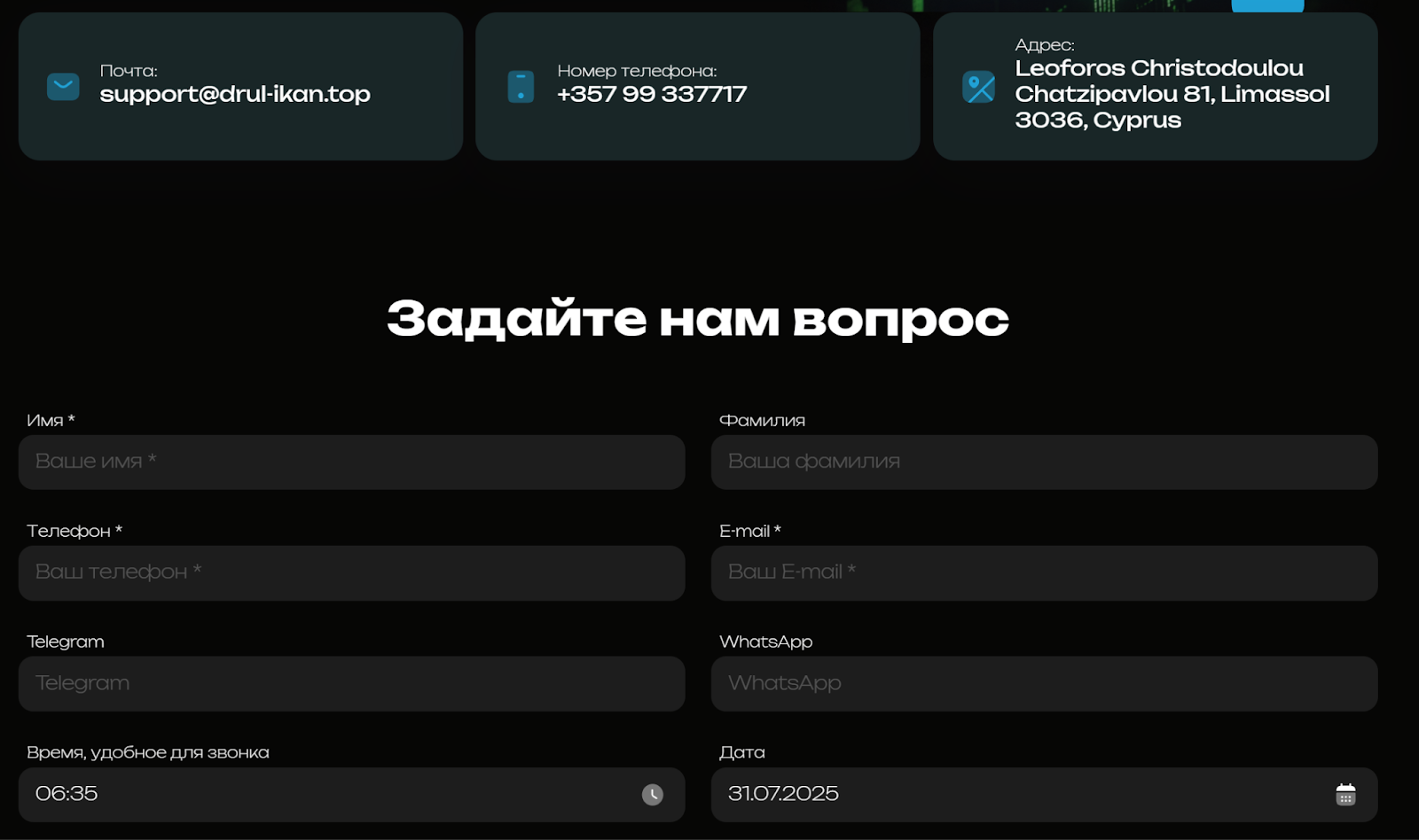 Связаться со службой поддержки крайне сложно. В описании говорится, что главный офис находится на Кипре. Есть почта support drul-ikan top и телефон +3-57-99-33-77-17, но полноценной обратной связи нет. Обращение через специальную форму также не дает результата.