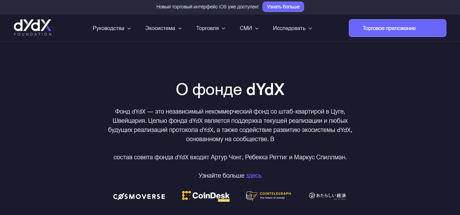Понятно, что у такого проекта с регистрацией сложно. Но разработчики и руководство не скрывают своих имен и лиц. Они создали не только уникальную цифровую экосистему, но независимый некоммерческий фонд Dydx со штаб-квартирой в Цуге.