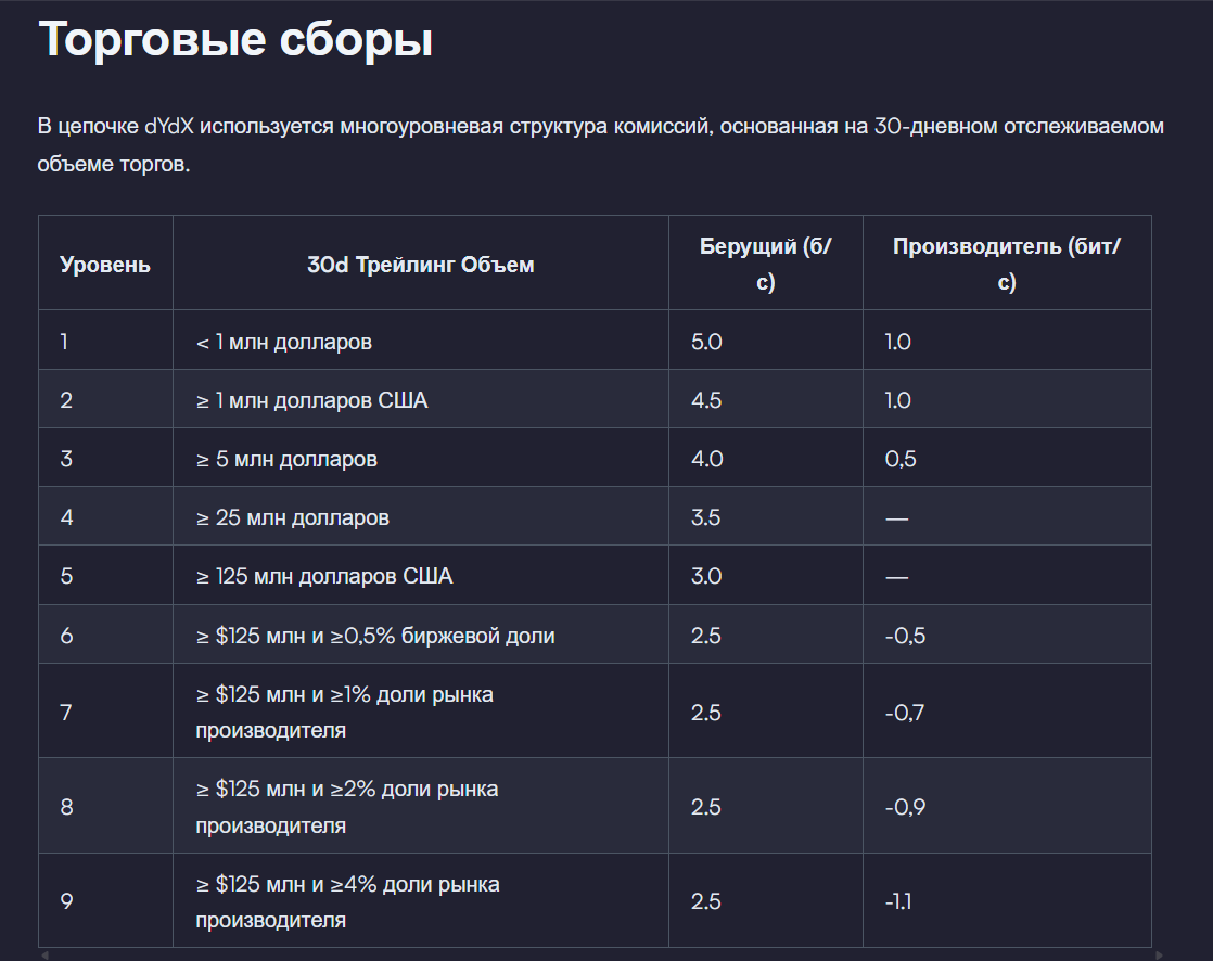 DYdXprotocol обеспечивает не только безопасность транзакций. В блокчейне используют многоуровневую системы комиссий, в целом они более выгодные, чем средние по рынку. Платформа работает по принципу «Тейкер»-«Мейкер».