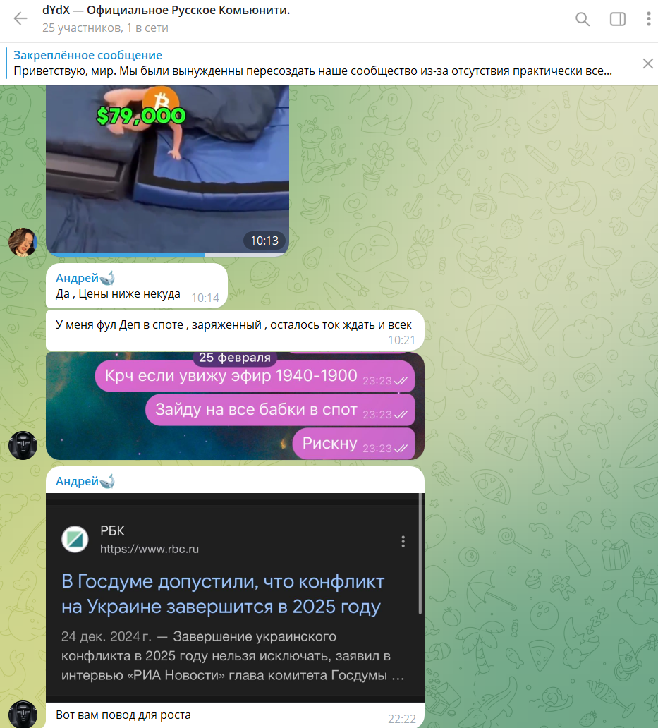 В русскоязычной группе dydx в tg еще меньше участников – всего 25. Dydxrussia – чат с перепиской. Возможно, каналом просто мало занимаются.