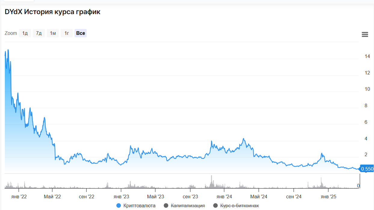 В 2021 году на бирже появился DYdX, собственный токен. С момента выпуска курс сильно упал. Нижняя отметка – 0,5319, зафиксирована в апреле 2025 года, верхняя – 15,08, в ноябре 2021 года. Лучший год для монеты и ее стоимости – 2023. Многие из тех, кто ожидал ее листинга, оказались разочарованы.