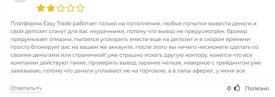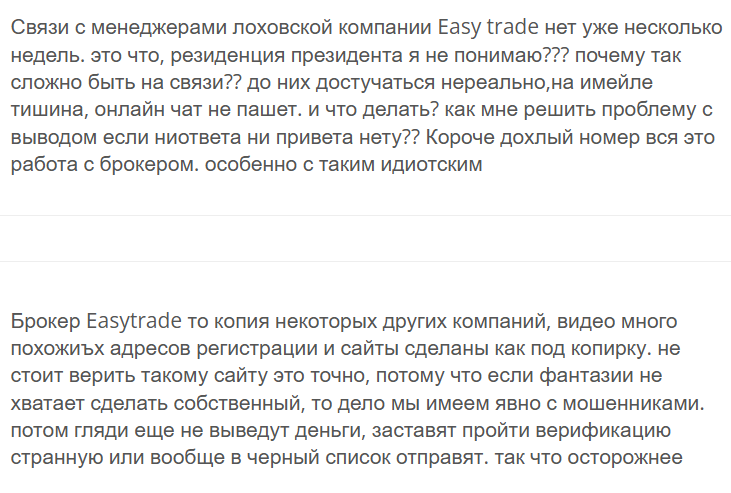 В сети встречаются отзывы об Easytrade fun, которые показывают компанию с негативной стороны. Люди пишут, что вывести деньги оказывается невозможно. Пользователям не отвечает служба поддержки, поэтому они не могут решить возникающие с сервисом проблемы. Это типичное поведение мошенников. Поэтому отклики пользователей доказывают сомнительность репутации организации.