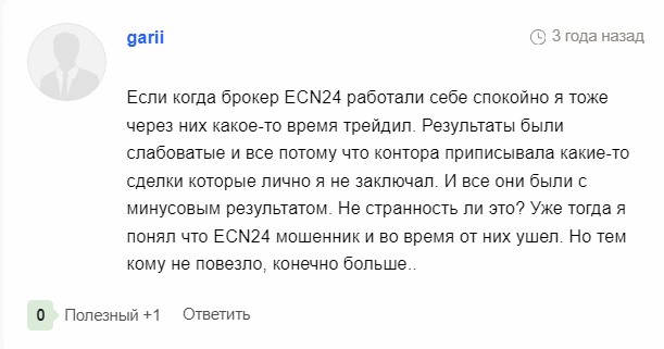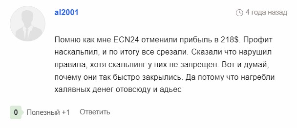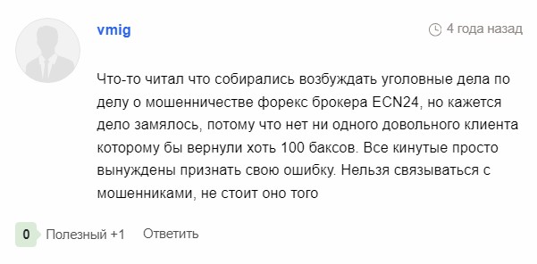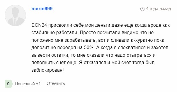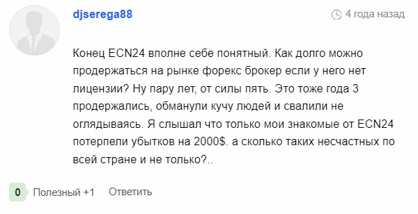 Отзывы о брокере ECN24 разнятся. Когда компания еще работала в положительных комментариях хвалили удобный торговый терминал. Но все это было на момент, когда организация еще существовала. Сегодня в сети о конторе можно найти только негатив. Трейдеры рассказывают, что не успели вывести деньги. Учитывая блокировку, аккаунтов с деньгами можно попрощаться.