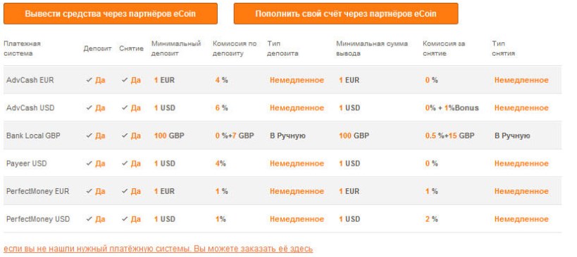На криптобирже «Екоин» для торговли были доступны только биткоин и литкоин. Ввести или вывести крипту можно было через электронные кошельки Payweb, AstroPay, PerfectMoney, Payeer, OKPAY, Egopay. Завести на биржу или вывести фиат можно было через обменники или банковский перевод. Если возникали проблемы, то нужно было только написать в техподдержку на contact@ ecoinofficial org. Сборы за торговлю составляли 0,2% от суммы сделки. Комиссии на вывод зависели от валюты и выводимой суммы.