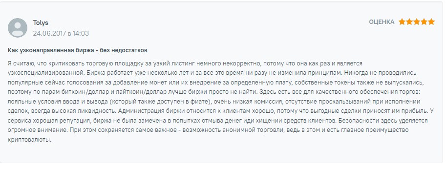 Из этих источников узнали, что на криптобирже было всего две торговые пары, но много удобных способов для ввода и вывода средств. Трейдеры говорили, что на платформе хорошие условия для торгов и удобный интерфейс.