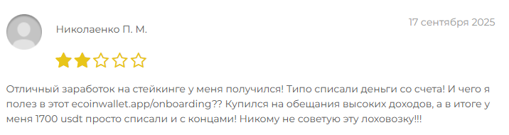 В сети нет положительных откликов о криптокошельке. В отзывах о EcoinWallet app основателей проекта прямо называют мошенниками, клиенты жалуются, что в реальности заработка на стейкинге не получается.