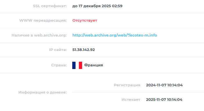 Мы проверили ресурс брокера Ecotex ml с помощью сервиса 2ip. Сайт защищен протоколом шифрования SSL до 17 декабря 2025 года. Домен зарегистрирован в 2024 году, во Франции. Это противоречит информации брокера.