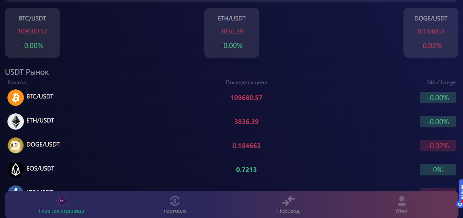 Веб-сайт брокера встречает случайных гостей логотипом компании и кнопкой входа/регистрации. На главной странице данного ресурса вы не обнаружите вкладок с лицензиями, юридическими документами, пользовательского соглашения и других профильных материалов. Даже регистрация на портале не поможет вам ничего узнать о фейковом посреднике. В личном кабинете пользователя встречают лишь разделы «Главная», «Торговля», «Перевод», «Мои».