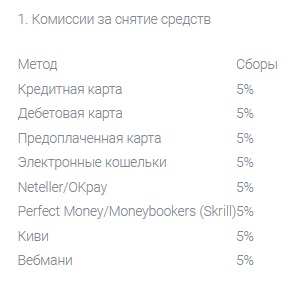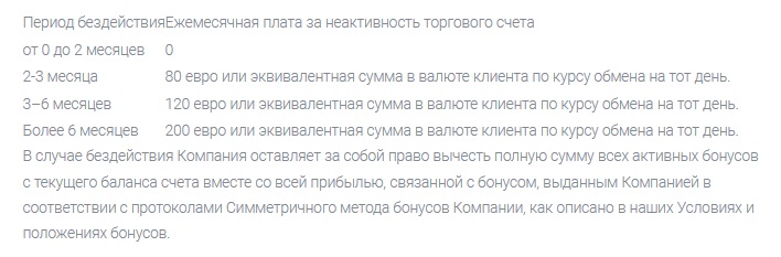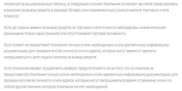 Из приведенной таблицы можно узнать, что комиссия на вывод равняется 5% для любого способа. Однако ниже есть информация, что в некоторых случаях в качестве комиссии будет списываться 50 евро. Это значит, что в любой непонятной ситуации брокер будет «обворовывать» клиента.Также есть и некая плата за бездействие. Более того, чем больше клиент неактивен, тем больше с него взимается денежных средств. Таким образом, если пользователь ненадолго отвлечется от своей трейдерской деятельности, он может понести серьезные убытки и потерять крупную сумму денег. Все это намекает на возможный скам от Egowim.