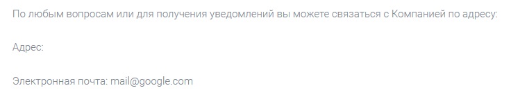 Раздела, отвечающего за обратную связь со техподдержкой, на сайте нет. Однако во время изучения документа «Соглашение с клиентом» был обнаружен адрес электронной почты – mail@google.com. Даже невооруженным взглядом видно, что это всего лишь некий шаблон, скопированный из интернета.
