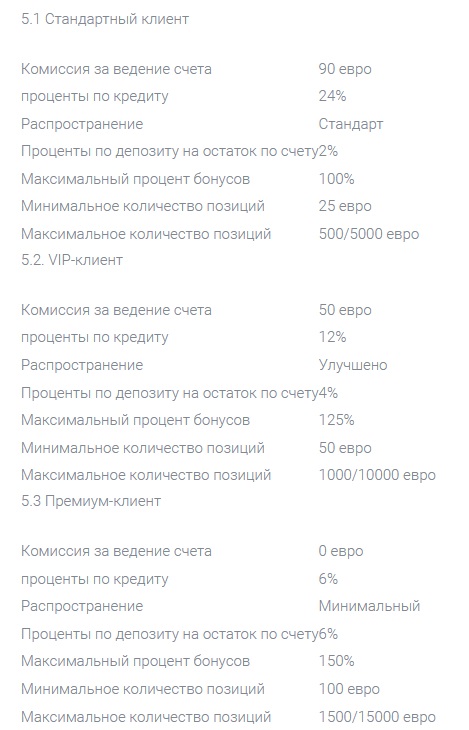 Согласно правилам, все пользователи площадки делятся на три категории – стандартный, VIP-клиент и премиум-клиент. Данное распределение происходит на основании принадлежности к тому или иному типу торгового счета, которые имеют различия в размере комиссии за обслуживание, сумме минимального депозита, проценте дохода и наличии других преимуществ.