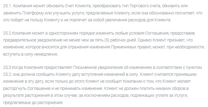 Также на основании вышеуказанной документации брокер имеет право менять условия договора с клиентом в одностороннем порядке. При этом уведомлять клиента необязательно. В этом же пункте говорится о том, что изменения вступают в силу сразу после публикации.