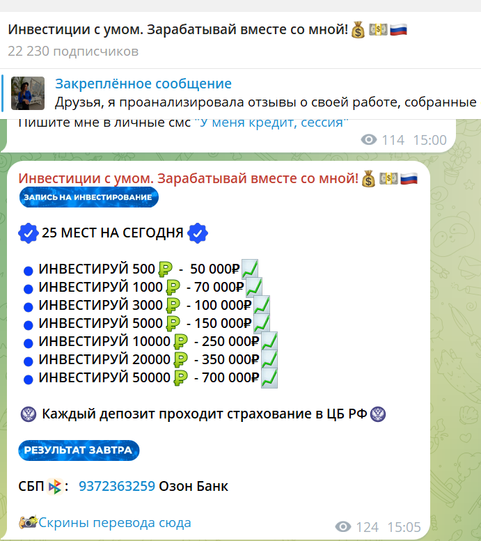 Екатерина предлагает вложить деньги в общий банк, а сумму обещает увеличить в несколько раз всего за пару часов, причем количество мест ограничено, а всего доступно несколько вариантов: