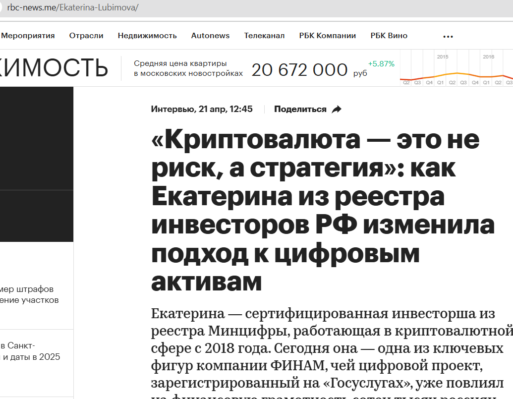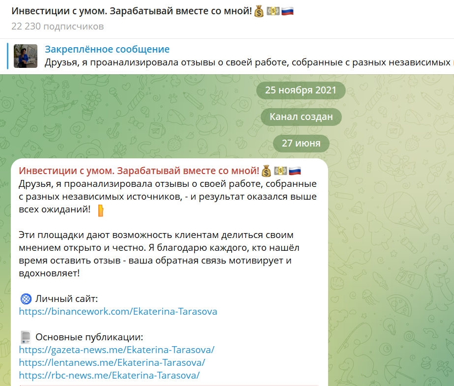 На канале в Телеграмм эксперт рассказывает, как зарабатывает на криптовалютах, но как именно она это делает, не сообщает. Девушка пишет про аккредитацию у брокера «Финам», но какое отношение трейдер имеет к этой компании неизвестно, а в первых постах указаны ссылки на статьи о Екатерине, только это фейковые сайты, которые копируют Lenta, Gazeta и Rbk.