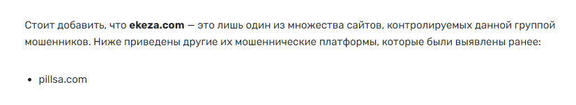 Про сайт ekeza com отзывы в сети найти не удалось. Но на многих сайтах мониторинга этот сервис индексируется как мошеннический. Пользователи утверждают, что второй сайт обменник скамеров pillsa.com также работает на обман трейдеров.