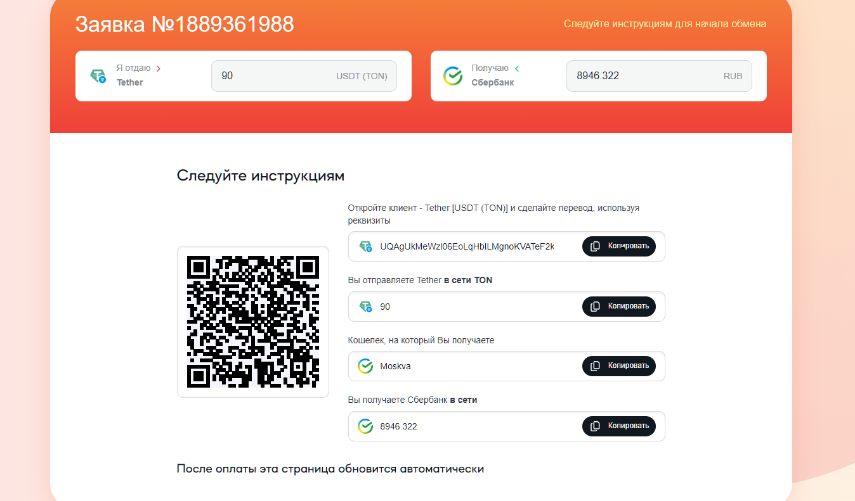 Деньги переводятся на частный криптокошелек. Потом клиент должен ожидать оплаты за обмен. Спойлер: деньги на счет за отправленную крипту не поступят. Это скам обменник, который не платит.