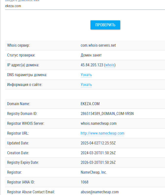 Домен сервиса был зарегистрирован в марте 2024 года. Хотя на сайте сказано, что ekeza обменник работает с 2016 года. Апгрейд сайта делали недавно, в начале апреля 2025 года. Мошенники часто делают модернизацию сайта, если хотят сменить платежные реквизиты. Это стандартная практика скамеров.