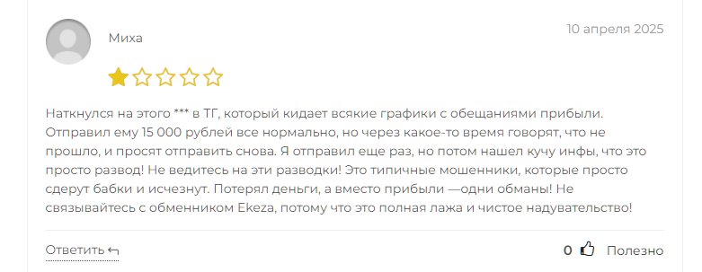 Найден один отзыв за апрель 2025 года, который полностью подтверждает наши предположения. Пользователя пригласили на сайт обменника через канал в ТГ. Он естественно потерял крупную сумму денег.