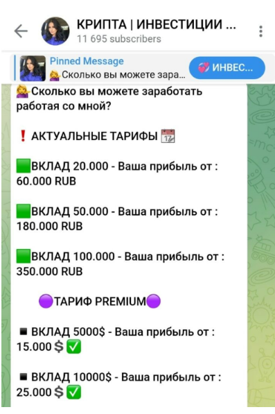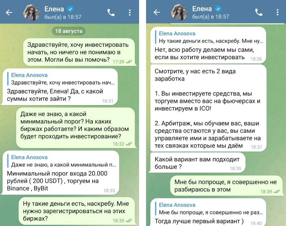 Продавать свои платные услуги трейдер Елена Сорокина стала не только в телеграм-канале, но в личных сообщениях с пользователем. В ходе переписки трейдер предлагает выбрать сотрудничество, в котором от клиента требуется только внести депозит, а все техническая работа возлагается на нее. Автор обещает, что прибыль будет гарантированная, но для ее выплаты нужно подождать около трех суток. Стоимость всего этого начинается от 20 тысяч рублей. Однако, есть еще один вариант работы вместе с Еленой, где вы сами под ее руководством будет торговать на бирже и совершать сделки.