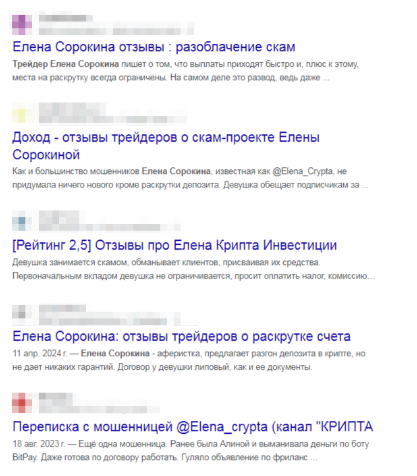 По данным из открытых источников, трейдер Елена Сорокина занимается базовыми инвестиционными услугами для трейдеров и всю деятельность ведет в телеграм-канале, который сейчас найти не удалось.